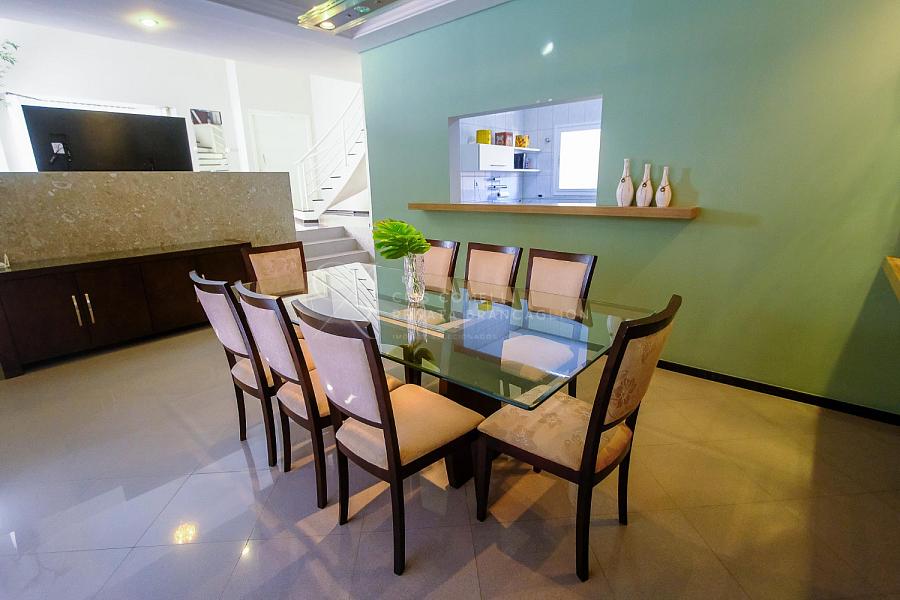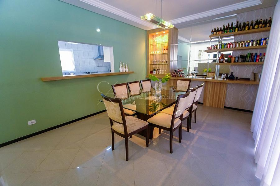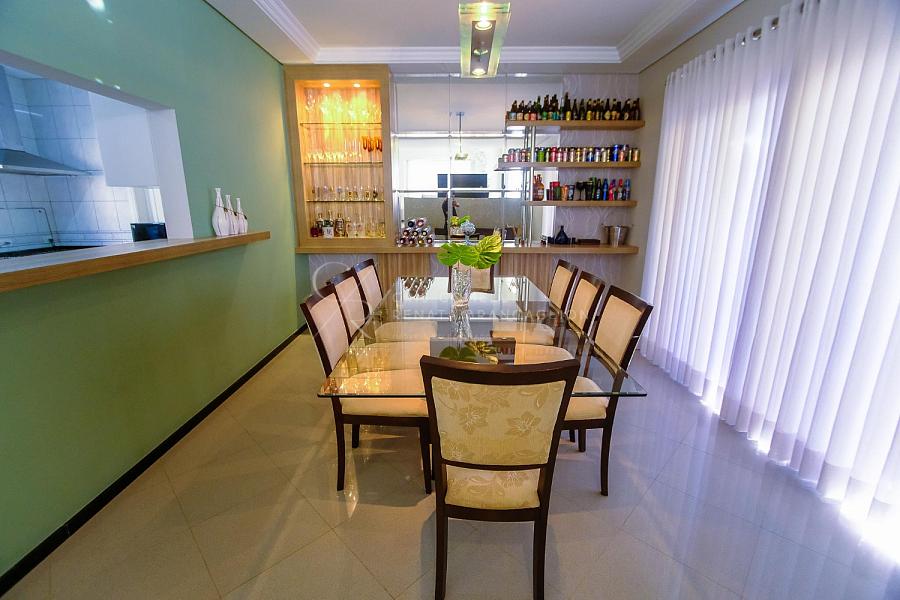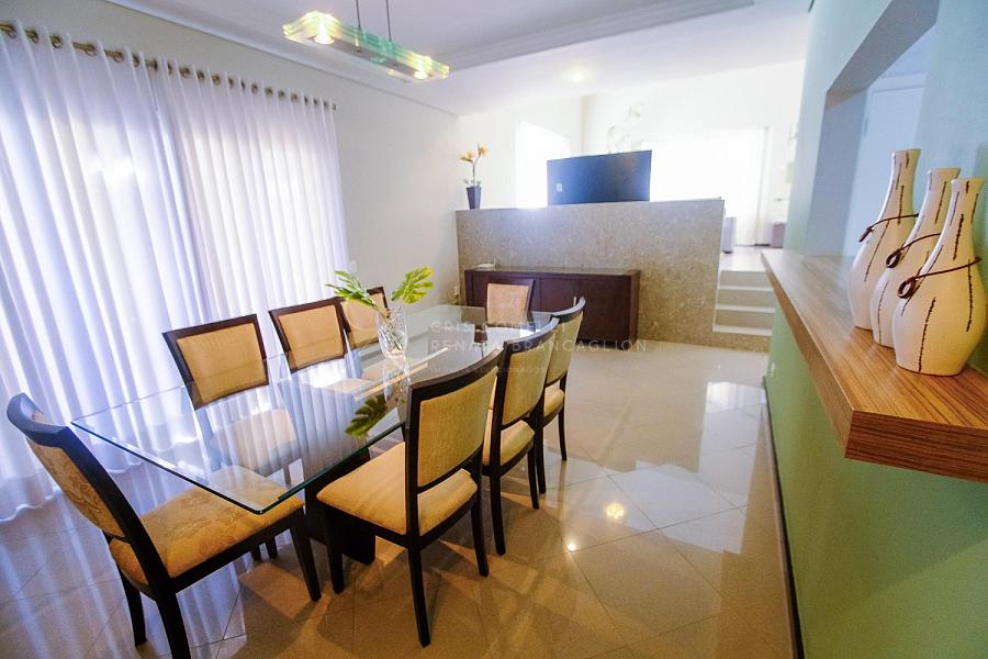 Quem sabe a composição das salas totalmente conectadas com esse pé direito duplo e com muita iluminação natural. Aqui todos os ambientes se comunicam. Sala de jantar com um passa prato para cozinha e ainda com vista para área gourmet.