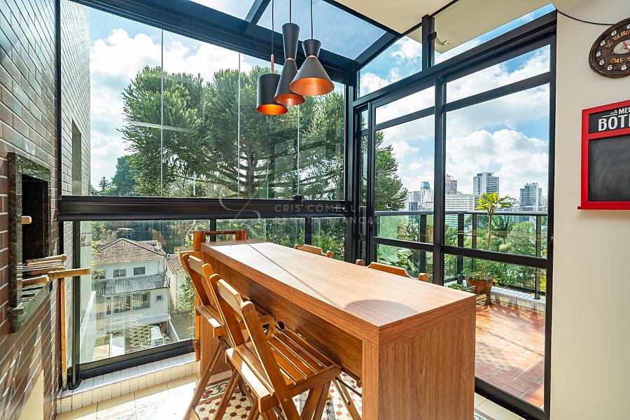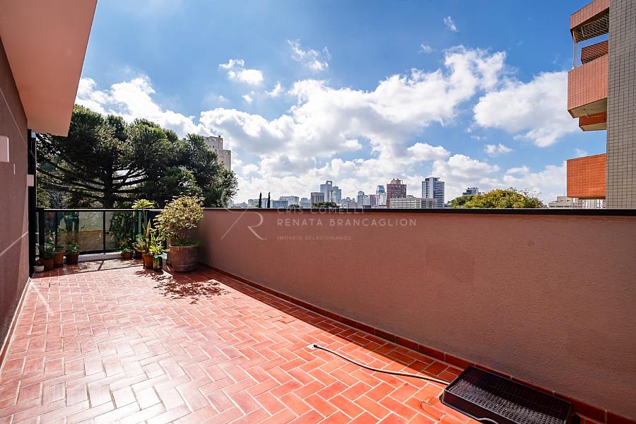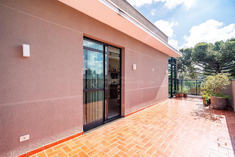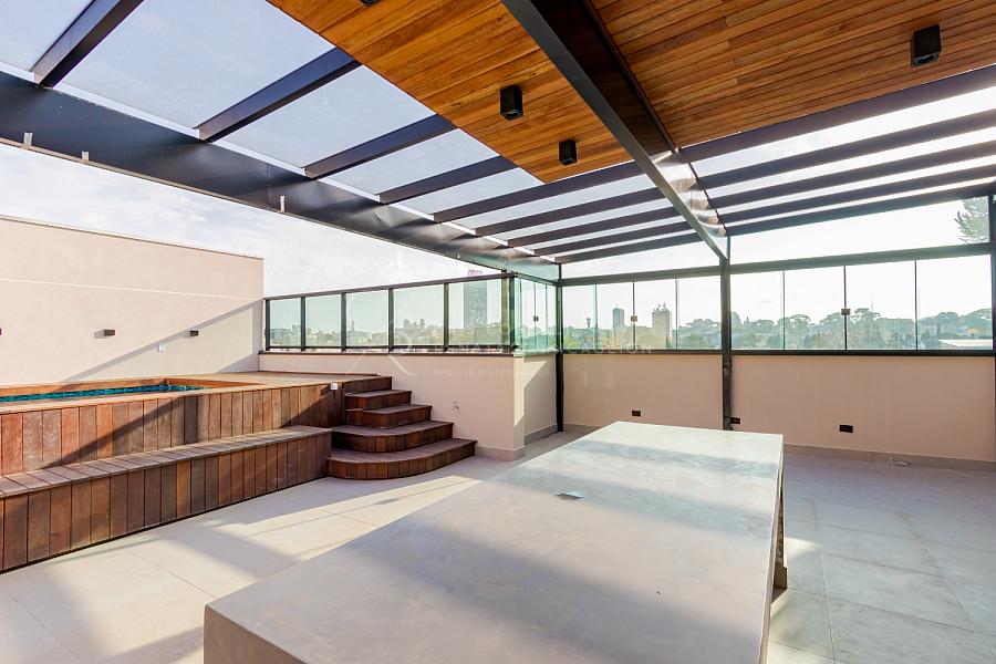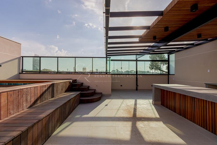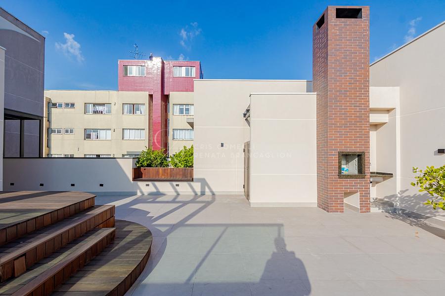 No andar superior, um espaço aberto fenomenal, com uma segunda churrasqueira e um terraço que convida o tempo a desacelerar. Perfeito para receber, para contemplar o céu de Curitiba ou simplesmente deixar os cachorros correrem livres sob o azul.